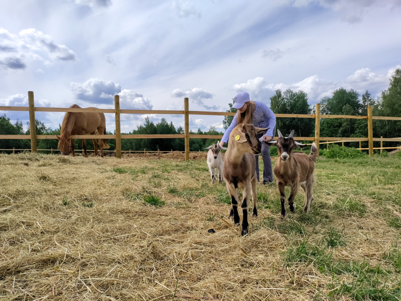 Девушка в бейсболке наклоняется и гладит козу на фермерском выгуле; рядом стоит еще одна коза, а на заднем плане виден белый козленок. Слева за деревянным забором пасется лошадь, передний план покрыт сеном и участками зеленой травы. В кадре читаются детали сельской инфраструктуры: секции ограждения, вытоптанная земля и открытая площадка для выгула. Освещение естественное, дневное, под облачным небом. Снимок можно использовать для иллюстраций о фермерских хозяйствах, уходе за животными, контактных зоопарках и сельском туризме.