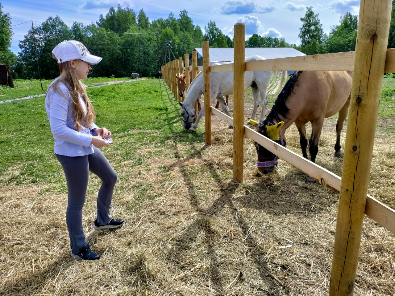 На снимке ребёнок в светлой кепке стоит у деревянного ограждения и наблюдает за лошадьми в загоне, в руках небольшой пакетик с кормом. Рядом пасётся гнедая лошадь в недоуздке с защитной маской от насекомых, за ней видна белая лошадь, опустившая голову к сену. По линии забора просматривается ещё одно животное; на фоне лесополоса, хозяйственное строение и облачное небо. Съёмка выполнена на открытом воздухе в летний день. Фото подойдёт для публикаций о конных фермах, экскурсиях, семейном досуге и безопасном общении с животными.