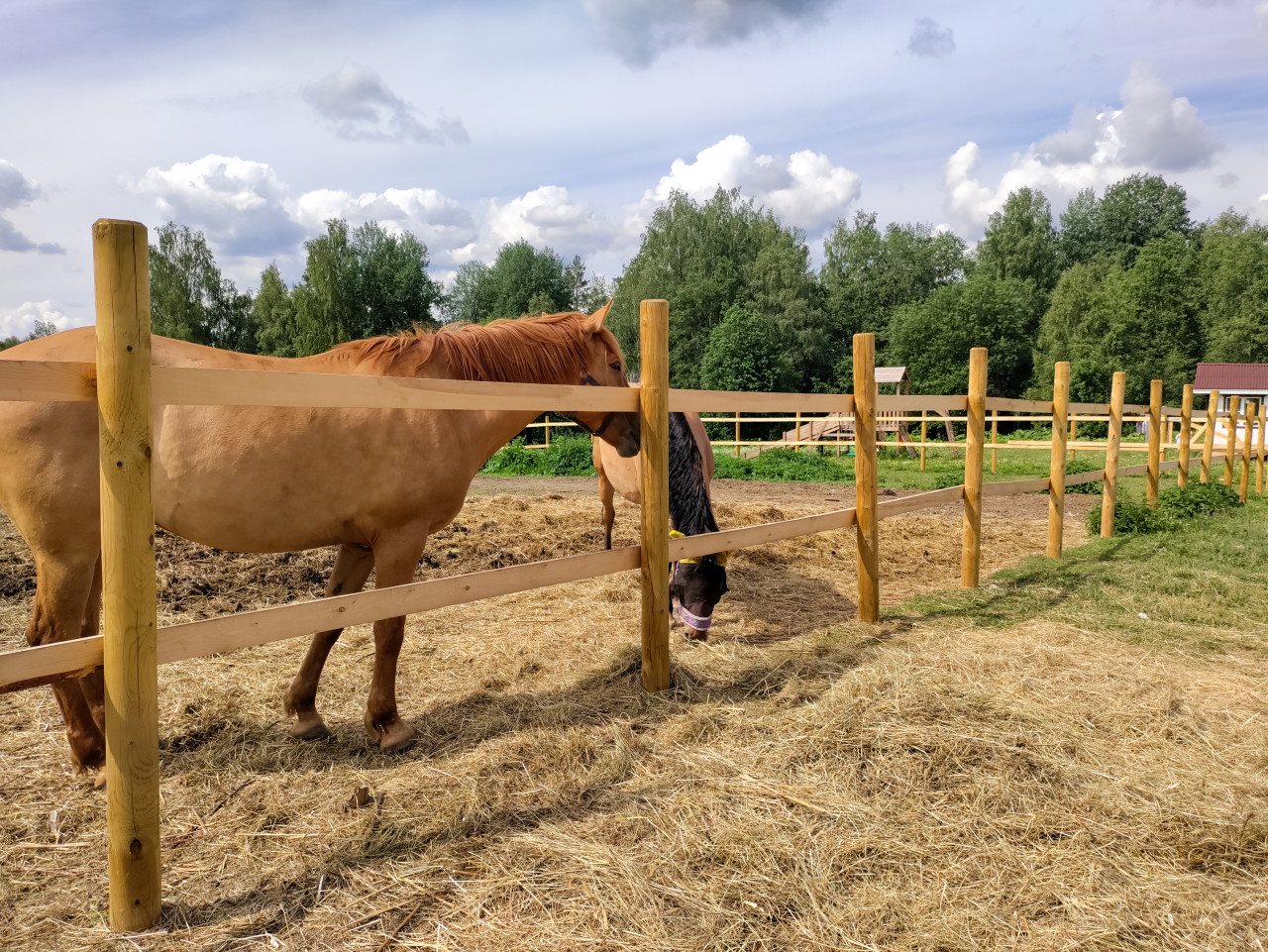 Широкий кадр конного загона: вдоль деревянного ограждения стоят лошади, рыжая расположена ближе к левому краю, другая с тёмной гривой пасётся на подстилке из сена; на ней заметен недоуздок. На земле видны солома и вытоптанные участки, за забором продолжается линия ограждений и зелёная трава. Вдалеке различимы небольшие постройки и деревья, над ними высокие облака. Съёмка выполнена на открытом воздухе в тёплый сезон. Фото подходит для тем о конных фермах, инфраструктуре выгула, содержании лошадей и загородных маршрутах.