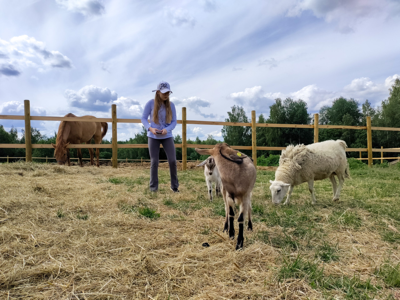 Девушка в бейсболке стоит на площадке для выгула животных, вокруг пасутся коза, козленок и овца; слева за забором видна лошадь, опустившая голову к сену. Передний план заполнен сухим сеном и травой, ограждение из деревянных стоек делит пастбище на секции. На дальнем плане темнеет линия леса, а над ней высокое небо с кучевыми облаками и просветами. Съемка выполнена на улице днем, без искусственного света. Фотография подойдет для рекламы фермерских экскурсий, публикаций о содержании животных, сельском туризме, экопросвещении и семейных активностях на природе.