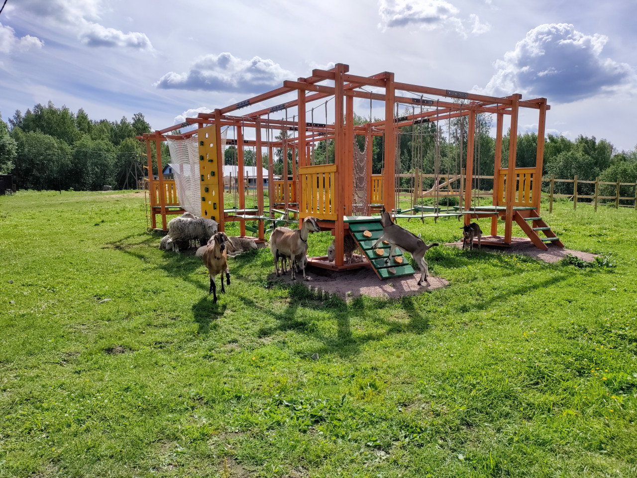 благоустройство детская площадка детские развлечения детский отдых детский досуг детское оборудование игровая зона игровое оборудование игровая площадка игровой комплекс развлечение физическая активность природа лето пастбище поле зелёная трава ферма сельская местность домашние животные козы коза козлёнок овцы стадо выпас поведение животных активность прыжок лазание деревянная конструкция верёвочный парк канаты сетка для лазания пандус скалодром настил ограждение деревянный забор лес на фоне облакаПохожие фотографии