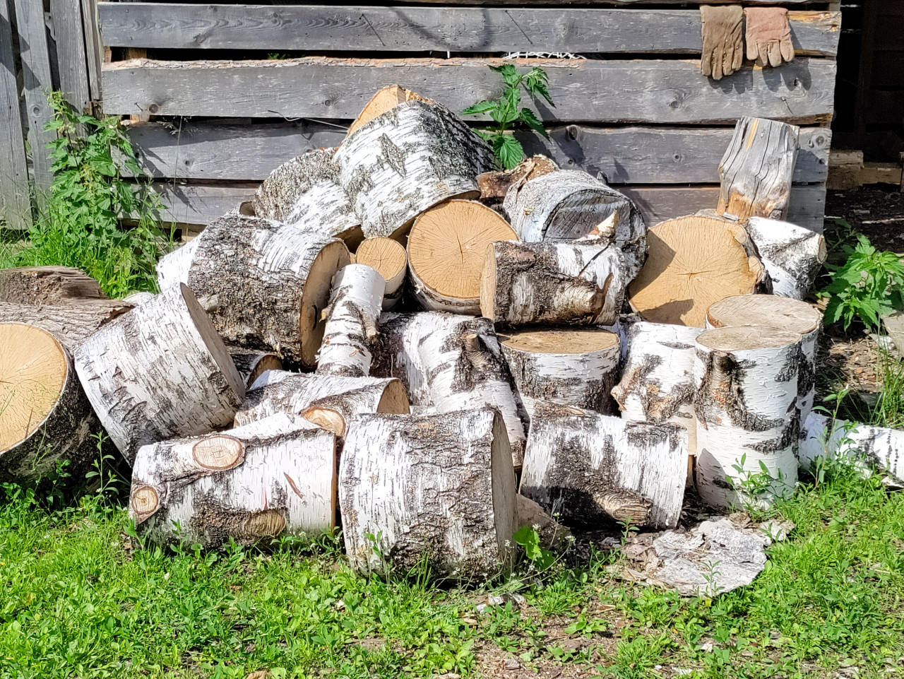 Крупный план заготовленных дров: на земле лежит куча коротких берёзовых чурок с белой корой и свежими светлыми спилами. Поленья разного диаметра сложены беспорядочно, видны годичные кольца и следы распила. На заднем плане — серая деревянная стенка из горизонтальных досок, вверху на доске висят рабочие перчатки. По краям растут зелёные растения и трава, на земле заметны щепки и фрагменты коры. Использование: материалы о заготовке топлива, хозяйственном дворе, деревенском быте, отоплении и работах по дому.