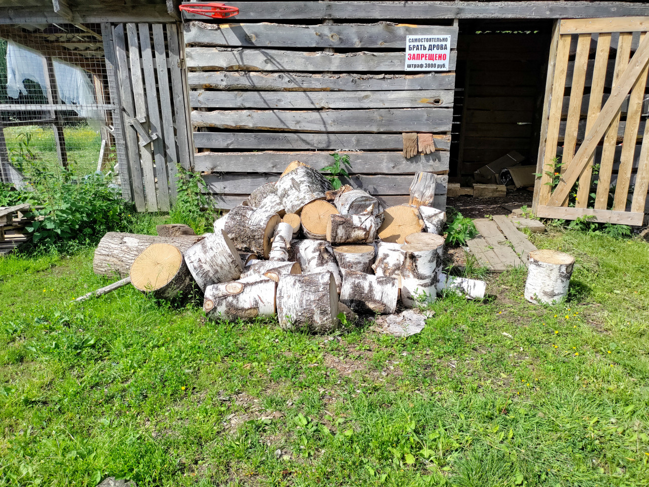 Берёзовые дрова у сарая с табличкой «Самостоятельно брать дрова запрещено»