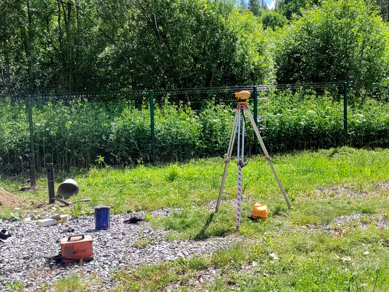Июнь 2024, открытый участок: на траве установлен геодезический прибор жёлтого цвета на алюминиевом штативе, рядом стоит нивелирная рейка с красно-белой шкалой. На земле видны щебёночная подсыпка, кабели и пластиковый кейс, отмечающие рабочую зону. По заднему плану проходит зелёное металлическое ограждение, дальше густые кусты и деревья. Снимок иллюстрирует этап геодезического контроля и разметки перед установкой свайного фундамента. Подходит для материалов о геодезии, подготовке стройплощадки и фундаментных работах.