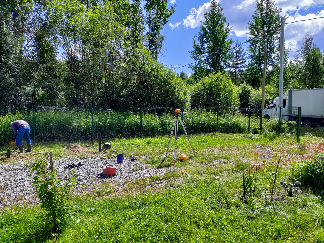 строительство геодезия геодезический прибор тахеометр нивелир штатив разметка участка контроль отметок свайный фундамент установка свай свайное монтаж свайного фундамента металлические сваи свайное поле щебень песок ведро инструмент кабель рабочий частное строительство загородный участок зеленый забор грузовик фургон столб провода голубое небо облака цветник сад лето июнь 2024Похожие фотографии