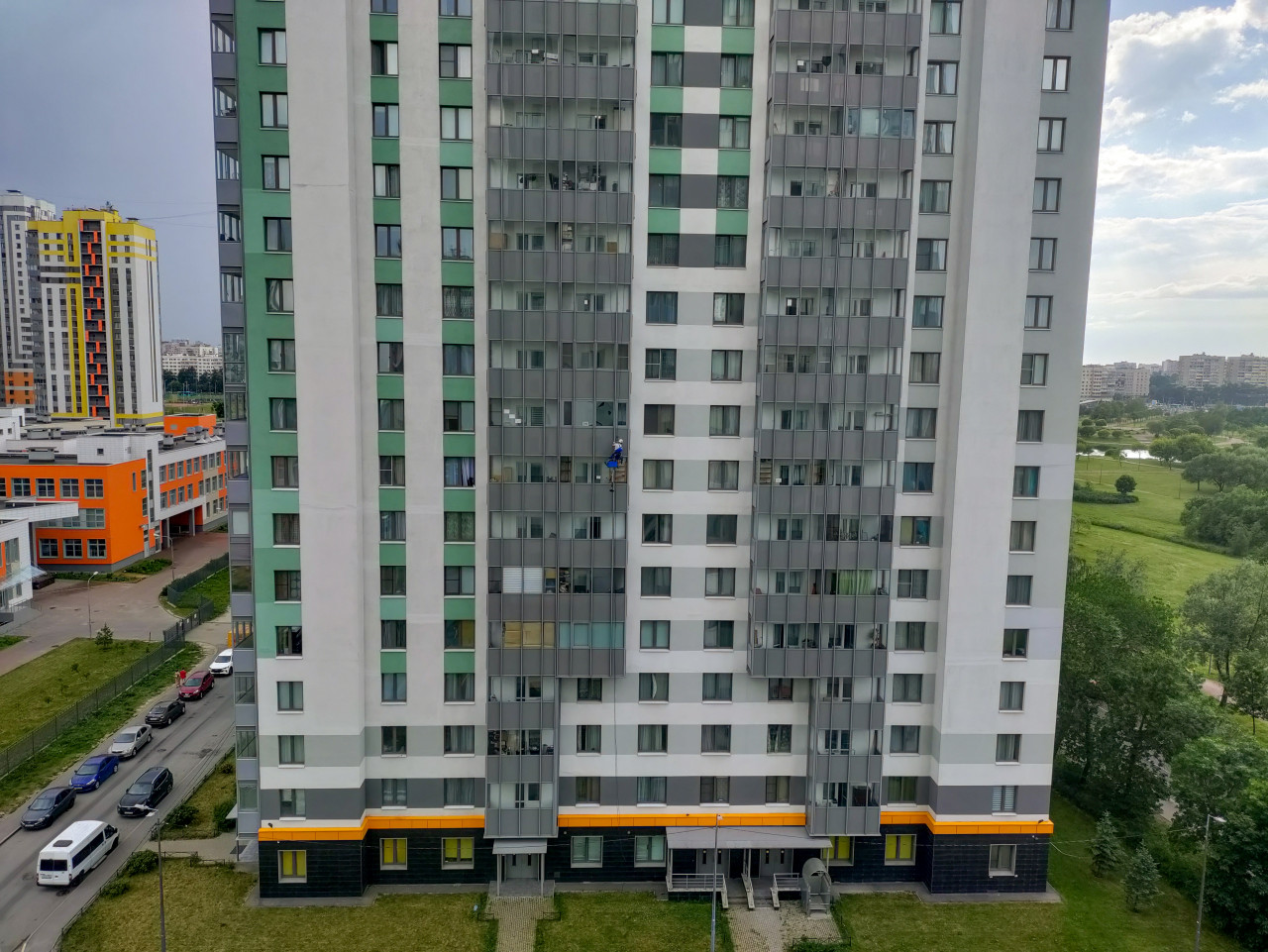 город урбанистика многоэтажный дом жилой комплекс фасад здания окна остекление промышленный альпинизм высотные работы промышленный альпинист страховка верёвки каска техника безопасности жкх новостройка двор улица автомобили парковка городской район работа на высоте обслуживание фасада мойка окон ремонт ЖКХ недвижимость современная архитектура панорама зелёная зона инфраструктура подъездПохожие фотографии