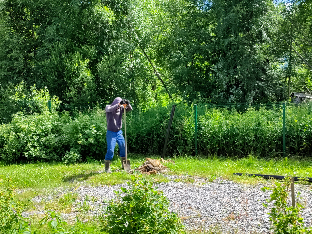Фотография показывает рабочий момент на объекте устройства свайного фундамента: рабочий стоит на травянистом участке и опирается на лопату рядом с лункой и кучей грунта, подготовленной для установки сваи. Рядом на земле лежит длинный чёрный элемент, используемый как свая или профиль для свайного основания, а передний план занят гравийной отсыпкой с редкими сорняками и молодыми кустиками. На заднем плане тянется зелёное ограждение и густая древесно-кустарниковая растительность. Яркий солнечный свет указывает на летний день. Фото подходит для тем о строительстве фундаментов, работах бригады и подготовке площадок.