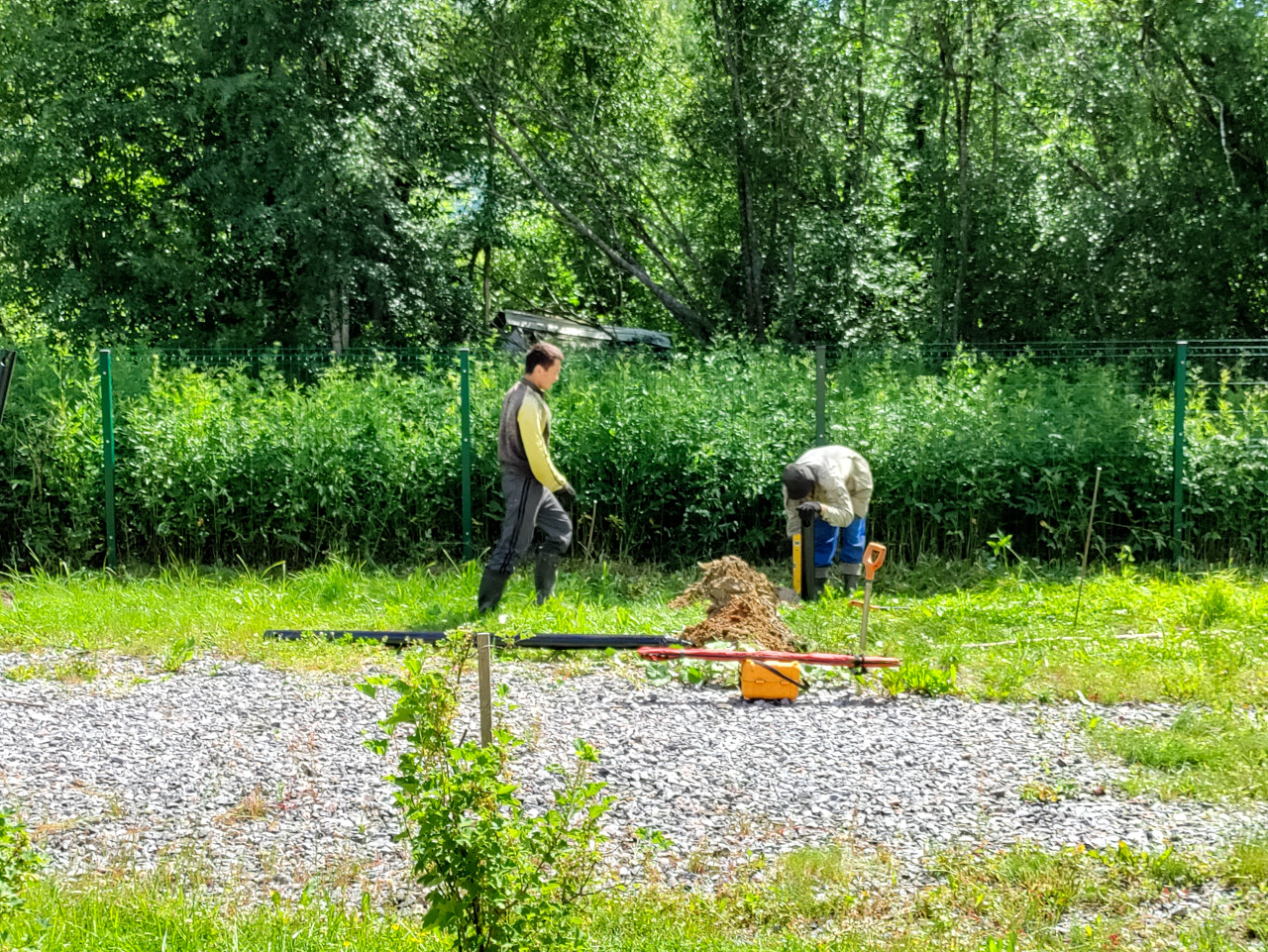 На снимке показан участок работ по установке свайного фундамента у зелёного ограждения. У кромки травы видна подготовленная выемка и отвал грунта, рядом уложены длинные чёрные элементы, используемые при монтаже свай, и размещён инструмент. Один рабочий идёт к точке установки, второй выполняет операции у лунки, что подчёркивает рабочий процесс на объекте. На переднем плане гравийная отсыпка и молодые кустики, на фоне плотная зелень деревьев при ярком дневном освещении летом. Фото подходит для материалов о свайных основаниях, строительных работах и подготовке площадок.