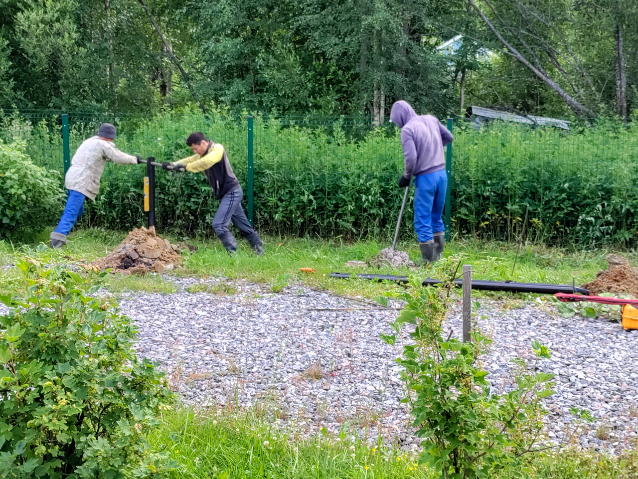 строительство свайный фундамент винтовые сваи установка свай монтаж стройплощадка рабочие грунт щебень разметка инструмент техника безопасности загородный участок лето фундамент установка сваи ручное приспособление направляющая металлическая свая бригада ручной труд земляные работы куча земли лопата металлические элементы участок дача загородное строительство основание выверка инженерные работы гравий трава кустарник лес дневной светПохожие фотографии