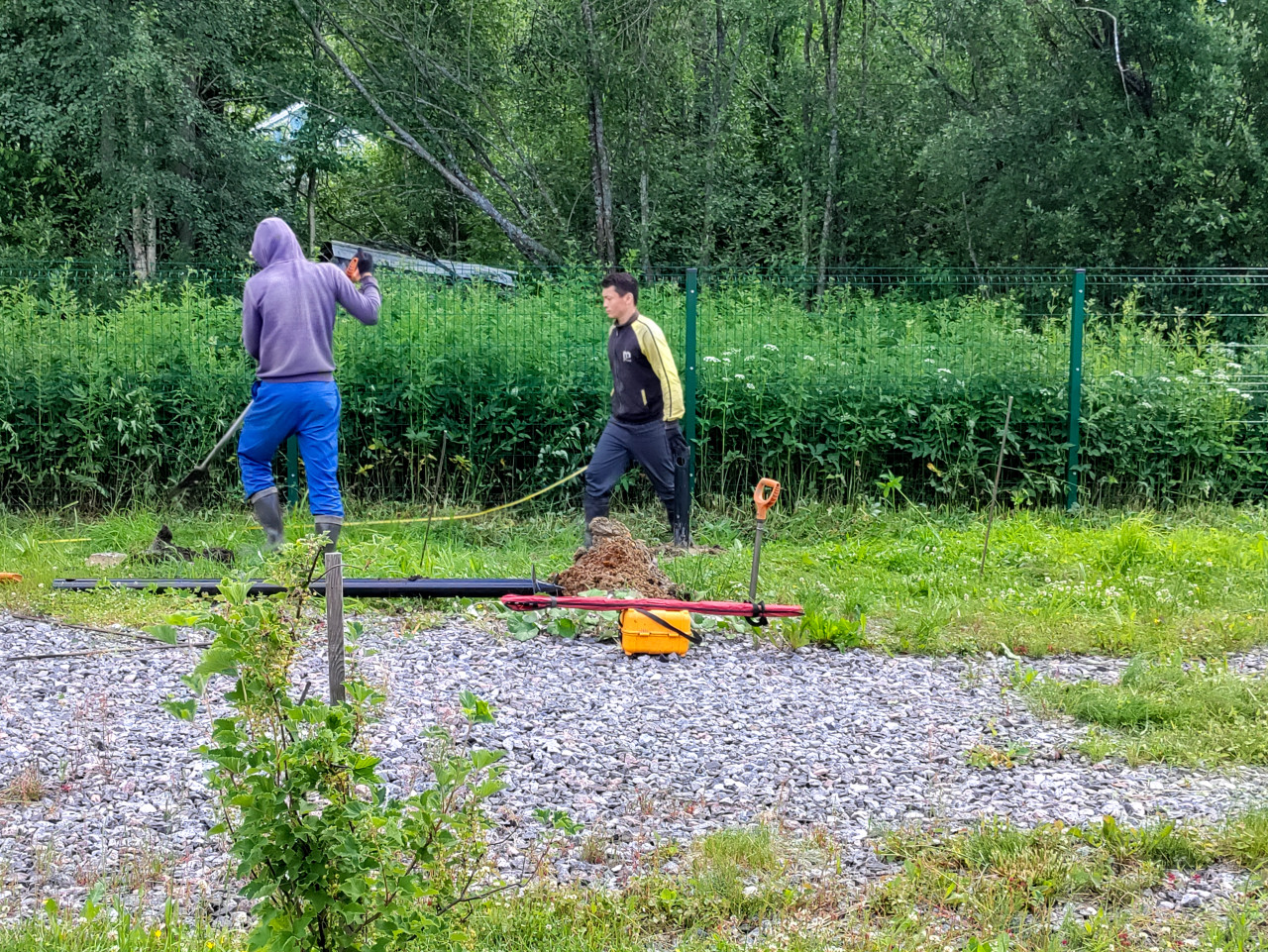На участке у линии ограждения рабочие проводят измерения рулеткой: лента натянута по траве, один человек фиксирует значение, второй держит инструмент рядом с кучей вынутого грунта. В кадре видны воткнутая лопата, металлические элементы, красная рейка и желтый ящик для инструмента на границе гравийной площадки. На фоне густые заросли и деревья. Дневной летний свет. Фото показывает этап разметки свайного поля перед установкой свай, когда проверяют шаг и геометрию. Подходит для материалов о проектировании, строительном контроле и подготовке фундамента.