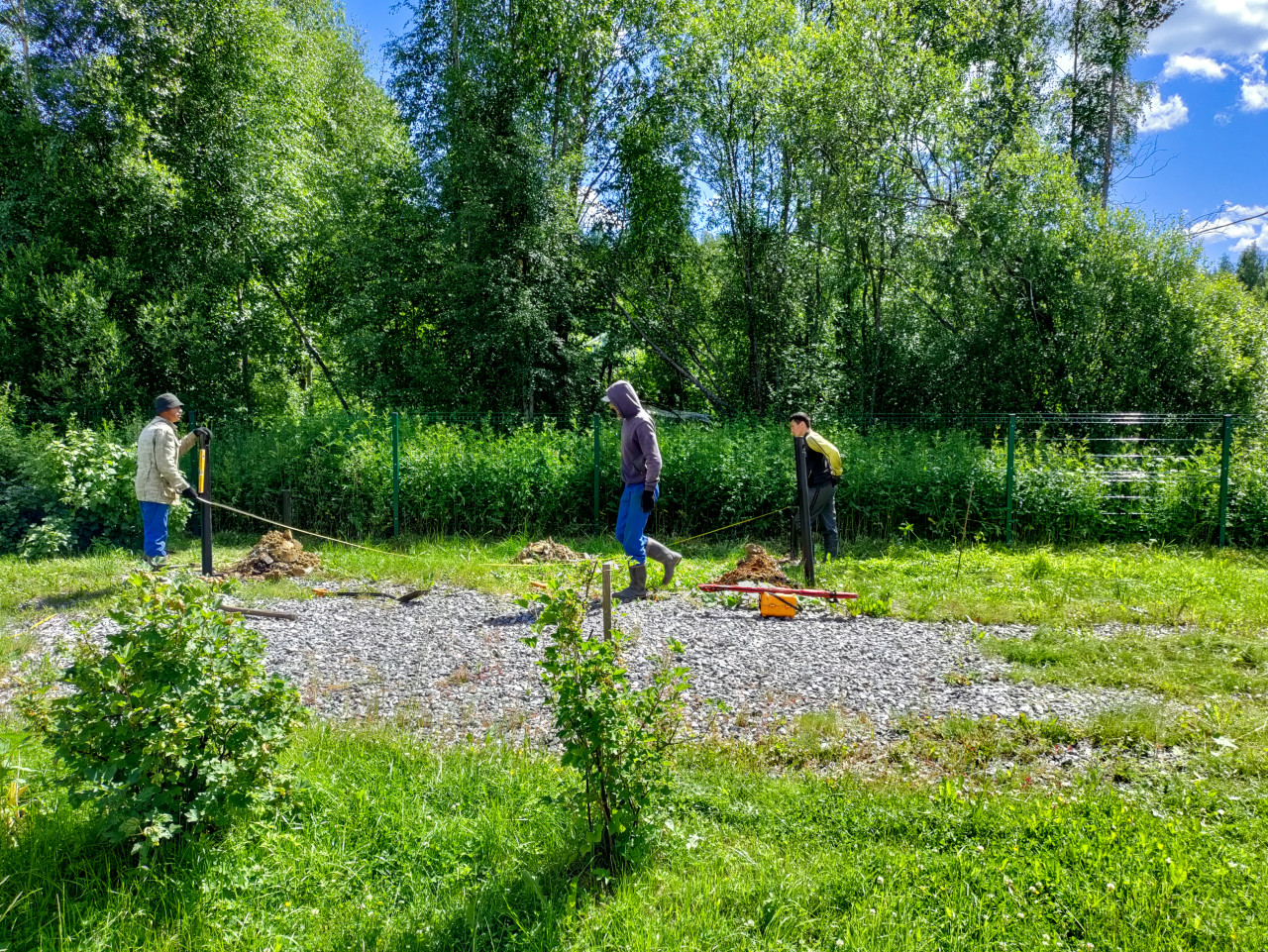 строительство свайный фундамент винтовые сваи установка свай монтаж стройплощадка рабочие грунт щебень разметка инструмент техника безопасности загородный участок лето фундамент измерение рулетка мерная лента разметка участка шаг свай свайное поле монтаж свай установка винтовых свай бригада строительные работы земляные работы кучи земли инвентарь участок ограждение забор зелёная зона деревья кустарник дневной светПохожие фотографии