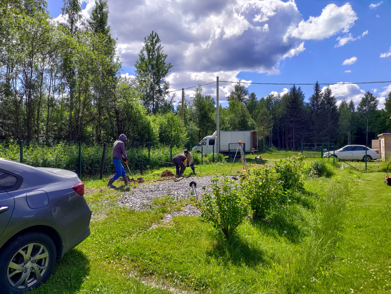 строительство свайный фундамент винтовые сваи установка свай монтаж стройплощадка рабочие грунт щебень разметка инструмент техника безопасности загородный участок лето ремонт частный участок дача подготовка основания монтаж свай разметка осей точки установки свай геодезия геодезический прибор тренога нивелир контроль отметок щебёночная площадка земляные работы ручной инструмент ограждение грузовой фургон линия электропередачи лесополоса летний день облачное небоПохожие фотографии