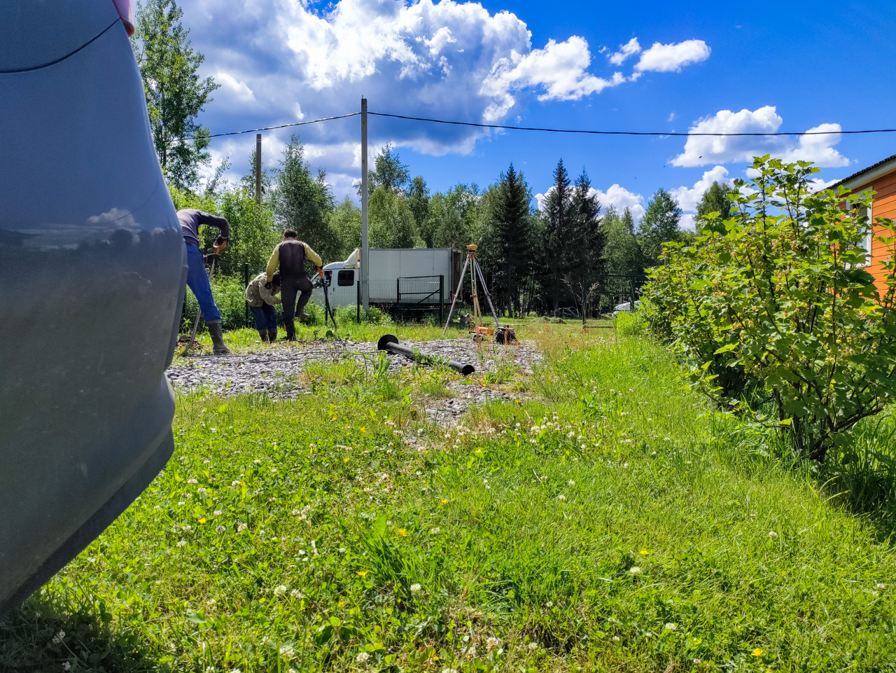 строительство свайный фундамент винтовые сваи установка свай монтаж стройплощадка рабочие грунт щебень разметка инструмент техника безопасности загородный участок лето подготовка фундамента монтаж опор разметка осей геодезия тренога нивелир контроль геометрии выверка щебёночная подсыпка строительная площадка частный участок дача загородный дом бригада элементы конструкции ограждение линия электропередачи столбы фургон зелёные насаждения лесной край летний день облакаПохожие фотографии