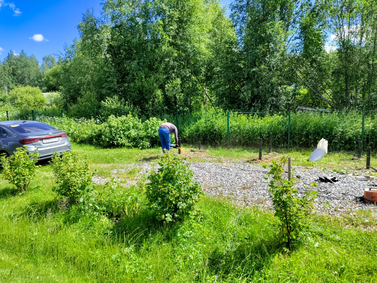 Летний рабочий момент на загородном участке: на щебёночной площадке установлен ряд металлических свай, рабочий использует механизированный ручной инструмент у основания одной из опор, поднимая облачко пыли. Вокруг видны следы монтажа и элементы оснастки, на щебне лежат перчатки и инвентарь, справа расположен белый мешок и часть оборудования. Передний план занимает газон с кустами, по границе участка стоит зелёное ограждение, за ним густая растительность и деревья. Слева припаркован автомобиль. Фото подходит для материалов о монтаже свайного фундамента и установке опор на частной стройке.