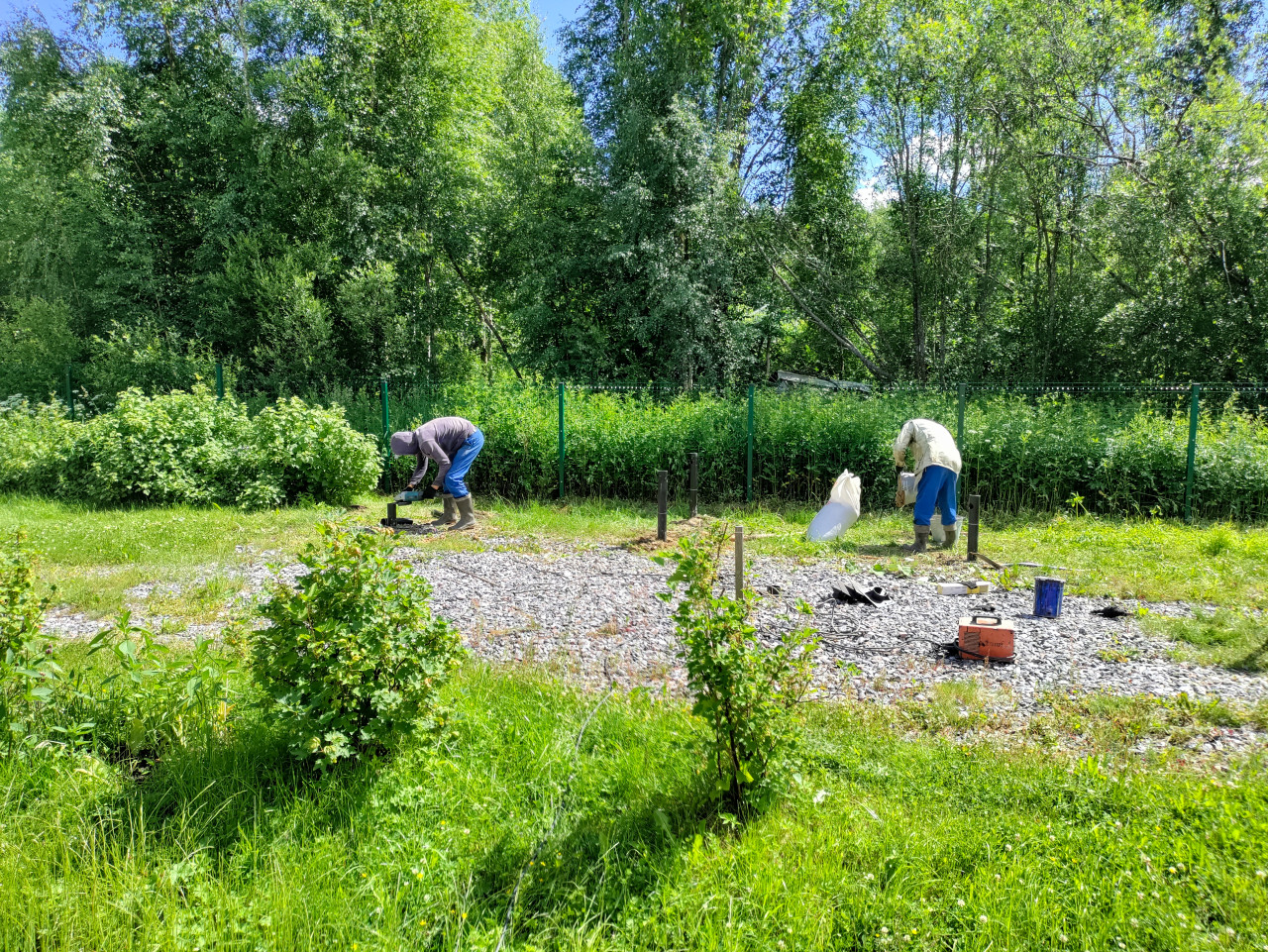 На снимке щебеночная площадка на частном участке, по периметру которой установлены металлические сваи по разметке свайного поля. Два рабочих в спецодежде одновременно выполняют операции по установке свайного фундамента у разных точек: один работает у сваи с инструментом, второй наклонился рядом с белым мешком и ведром. На земле заметны кабель, разложенные принадлежности и небольшой ящик. За площадкой тянется зеленый забор и густая растительность. Фото сделано в июне 2024; подходит для иллюстраций о монтаже свайного фундамента и строительстве на участке.