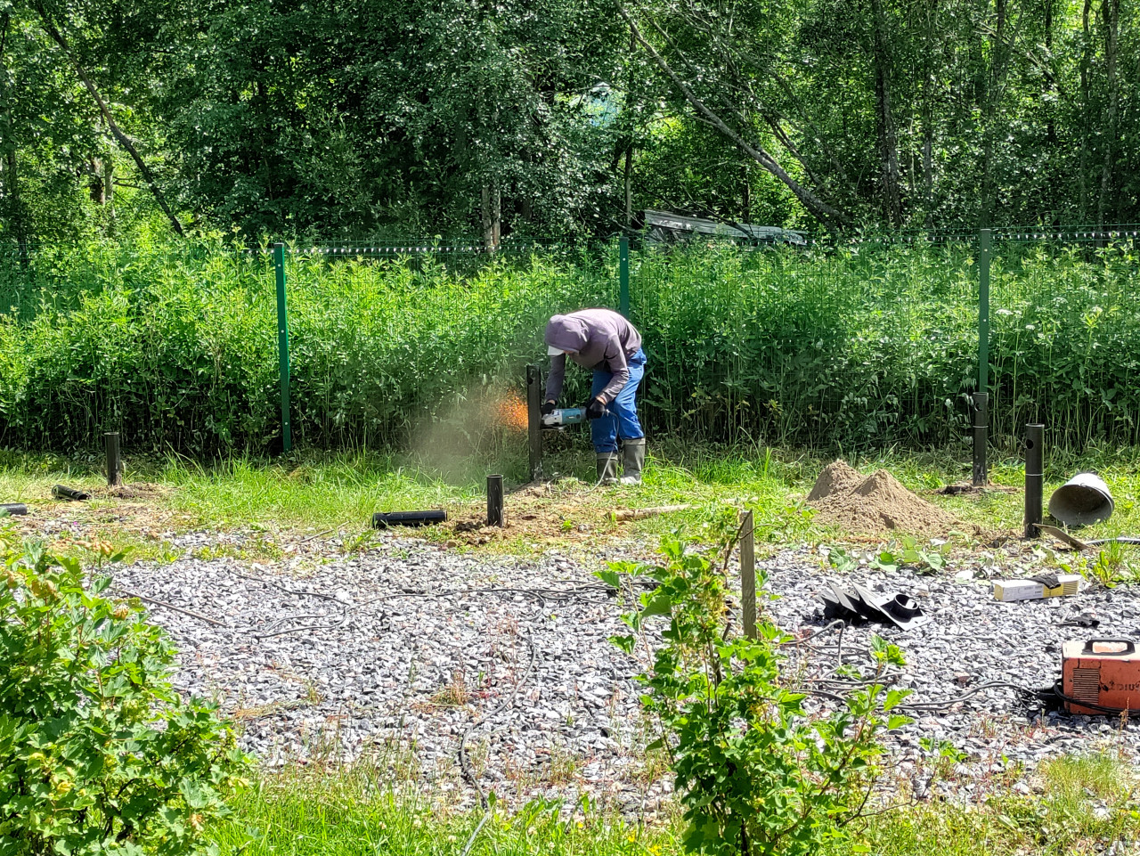 строительство свайный фундамент винтовые сваи установка свай монтаж стройплощадка рабочие грунт щебень разметка инструмент техника безопасности загородный участок лето монтаж свай металлическая свая труба резка металла болгарка углошлифовальная машина искры пыль подготовка свай подрезка по уровню фундаментные работы рабочий спецодежда перчатки кабели провода подсыпка организация работ зелёный забор высокая трава деревья июнь 2024Похожие фотографии