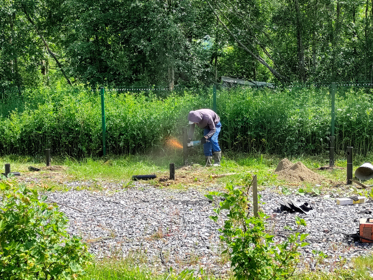 Подрезка металлического столба болгаркой на щебёночной площадке при монтаже свайного фундамента