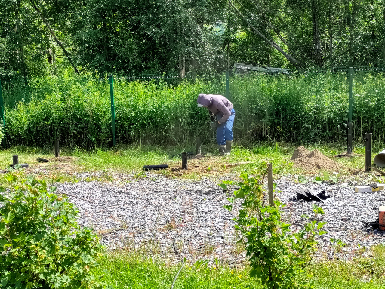 строительство свайный фундамент винтовые сваи установка свай монтаж стройплощадка рабочие грунт щебень разметка инструмент техника безопасности загородный участок лето монтаж свай металлическая свая труба электроинструмент рабочий пыль следы резки подготовка свай фундаментные работы организация рабочего места подсыпка кабели провода участок ограждение зелёный забор трава кусты деревья июнь 2024 ремонтно строительные работыПохожие фотографии