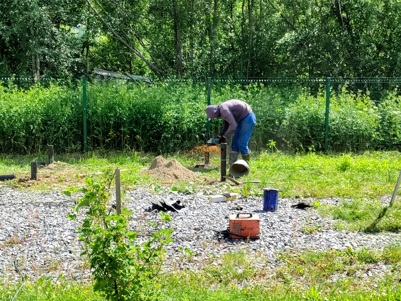 строительство свайный фундамент винтовые сваи установка свай монтаж стройплощадка рабочие грунт щебень разметка инструмент техника безопасности загородный участок лето свайное поле монтаж свай металлические сваи труба подрезка по уровню резка металла болгарка углошлифовальная машина искры электроинструмент рабочий процесс подсыпка кабели провода оборудование инструменты подготовка основания установка фундамента ограждение зелёный забор деревья трава июнь 2024Похожие фотографии