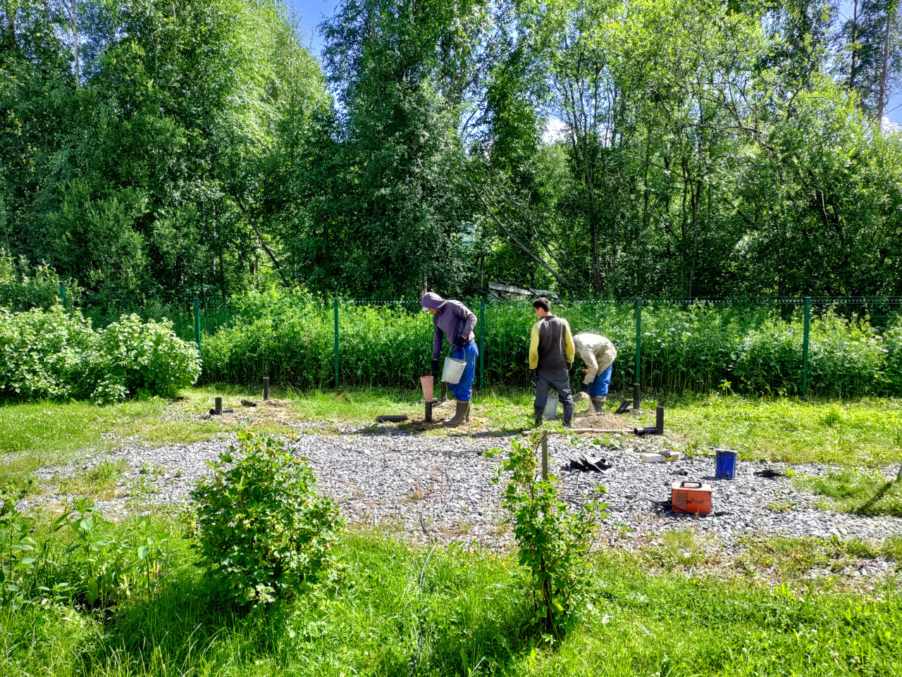 На открытой площадке у зелёного металлического забора трое рабочих монтируют свайный фундамент: в грунте уже стоят чёрные винтовые сваи с оголовками, вокруг видны пятна свежей выемки и щебёночная подсыпка. Один рабочий держит ведро и работает у сваи, другой выравнивает место установки, третий контролирует расположение опор. На земле лежат инструменты и материалы. Съёмка летом в солнечный день, вокруг высокая трава и густые деревья. Фото подходит для статей о свайных фундаментах, монтаже основания и организации работ на участке.