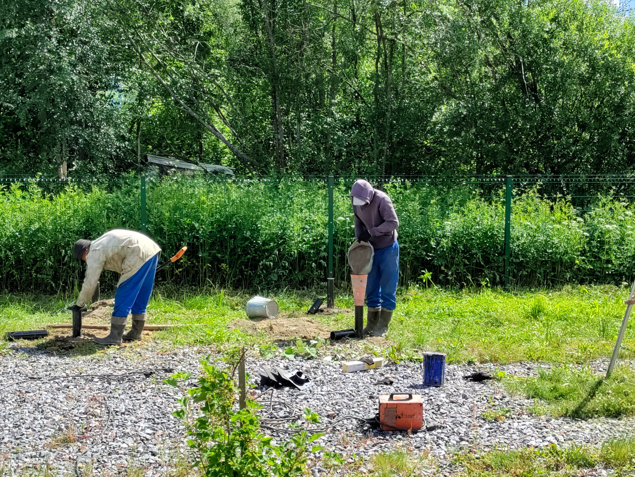 строительство свайный фундамент винтовые сваи установка свай монтаж стройплощадка рабочие грунт щебень разметка инструмент техника безопасности загородный участок лето фундаментные работы винтовая свая оголовок сваи подсыпка заполнение сваи выравнивание подготовка основания отсыпка песок ведро воронка перчатки оборудование кабели спецодежда участок зелёный забор высокая трава солнечный светПохожие фотографии