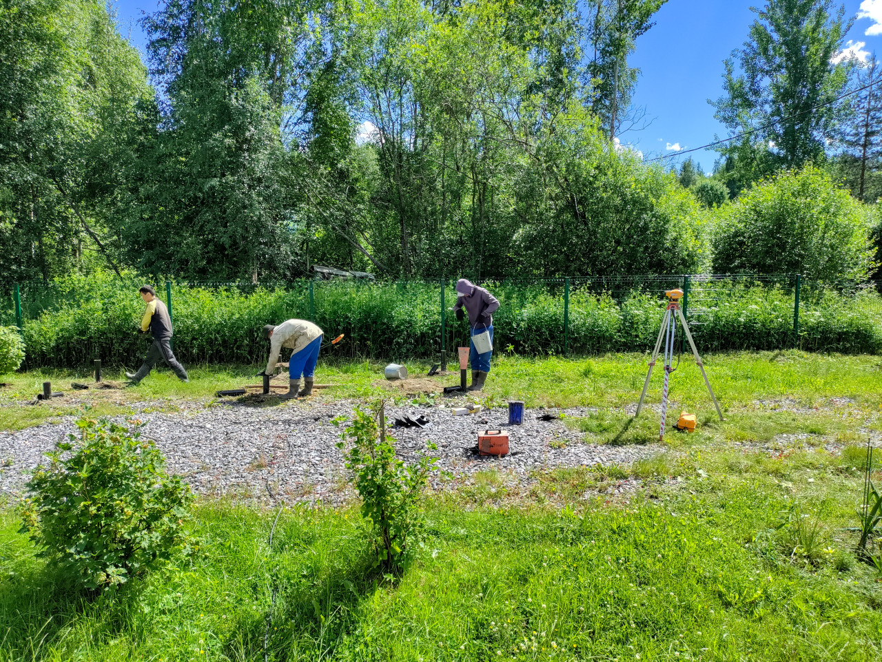 строительство свайный фундамент винтовые сваи установка свай монтаж стройплощадка рабочие грунт щебень разметка инструмент техника безопасности загородный участок лето геодезия нивелир штатив контроль высот отметки монтаж винтовых свай оголовки свай выверка инженерный контроль строительная площадка песок земляные работы ящик кабель бригада участок зелёный забор деревья солнечный деньПохожие фотографии