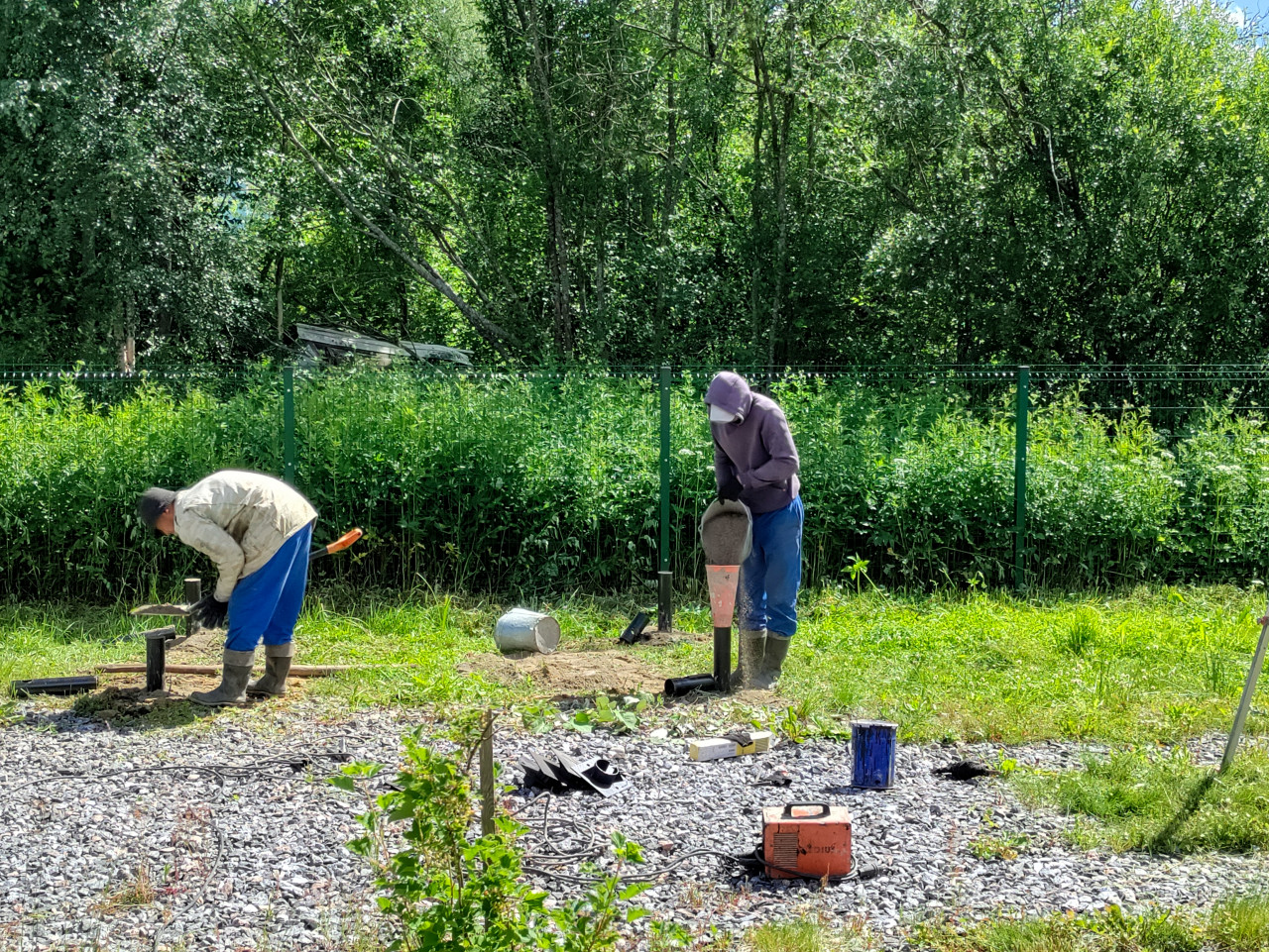 строительство свайный фундамент винтовые сваи установка свай монтаж стройплощадка рабочие грунт щебень разметка инструмент техника безопасности загородный участок лето установка винтовых свай оголовок выверка подсыпка заполнение подготовка участка земляные работы щебёночная подушка ведро ручной труд спецодежда бригада строительная площадка участок зелёный забор деревья солнечный день инженерные работы благоустройствоПохожие фотографии