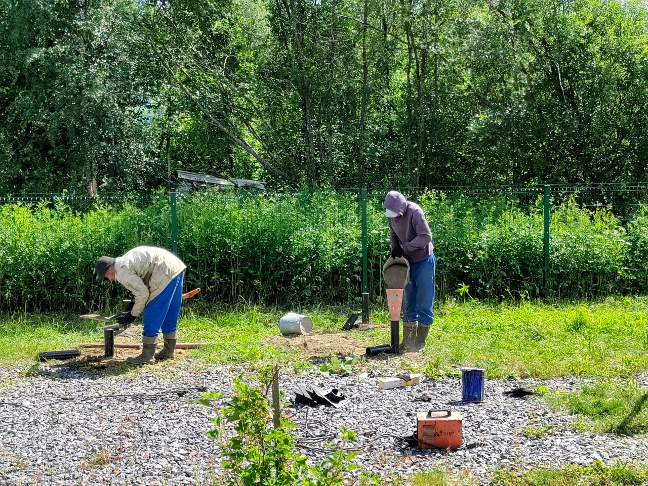 строительство свайный фундамент винтовые сваи установка свай монтаж стройплощадка рабочие грунт щебень разметка инструмент техника безопасности загородный участок лето монтаж свай винтовая свая оголовок сваи заполнение сваи подсыпка воронка ведро ручные работы подготовка узлов выравнивание земляные работы отсыпка оборудование провода перчатки коробки спецодежда участок зелёный забор высокая трава деревья летний сезон солнечный светПохожие фотографии