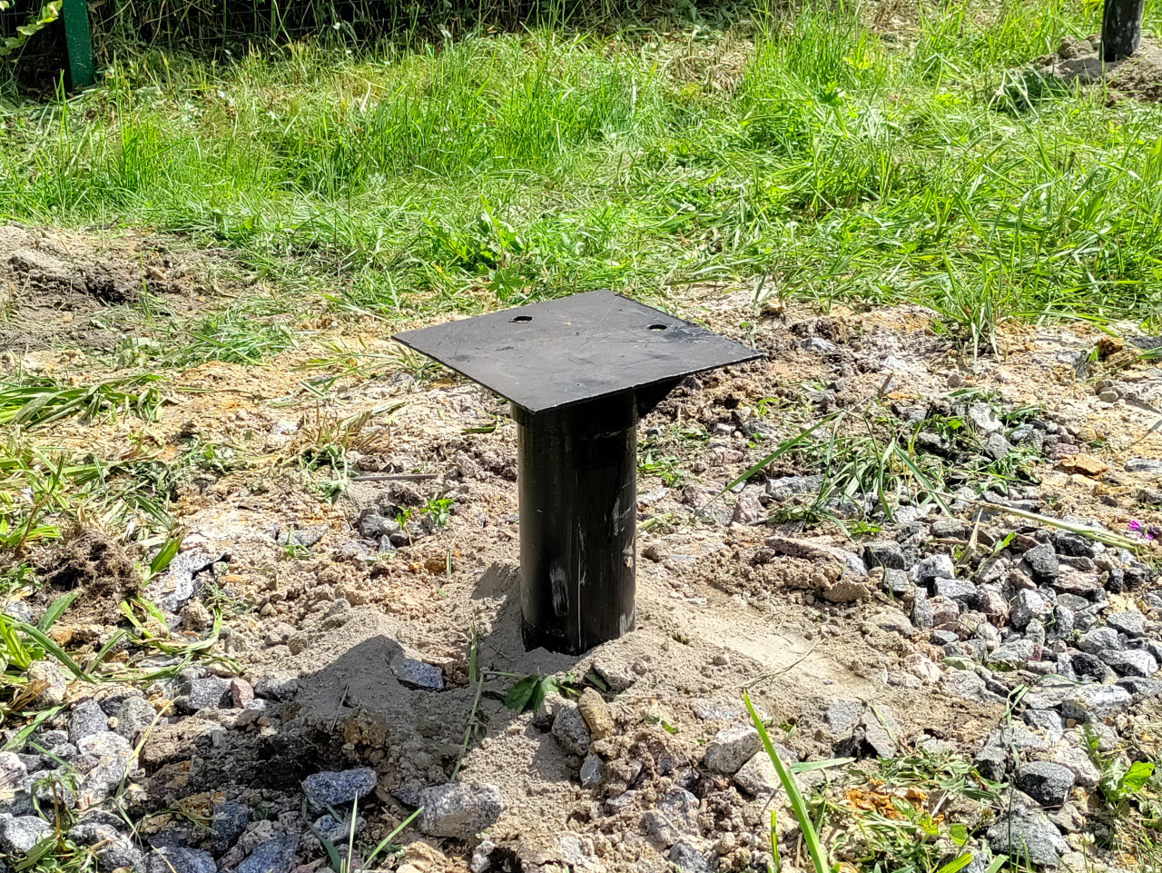 Оголовок винтовой сваи с квадратной площадкой на свежей подсыпке крупным планом