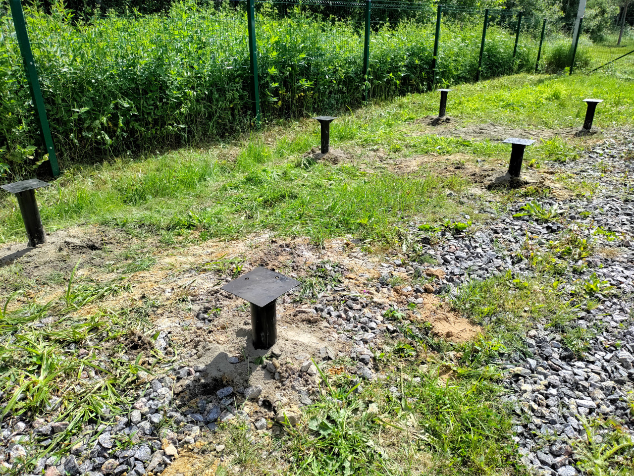 Ряд установленных винтовых свай свайного фундамента на травяной площадке вдоль ограждения