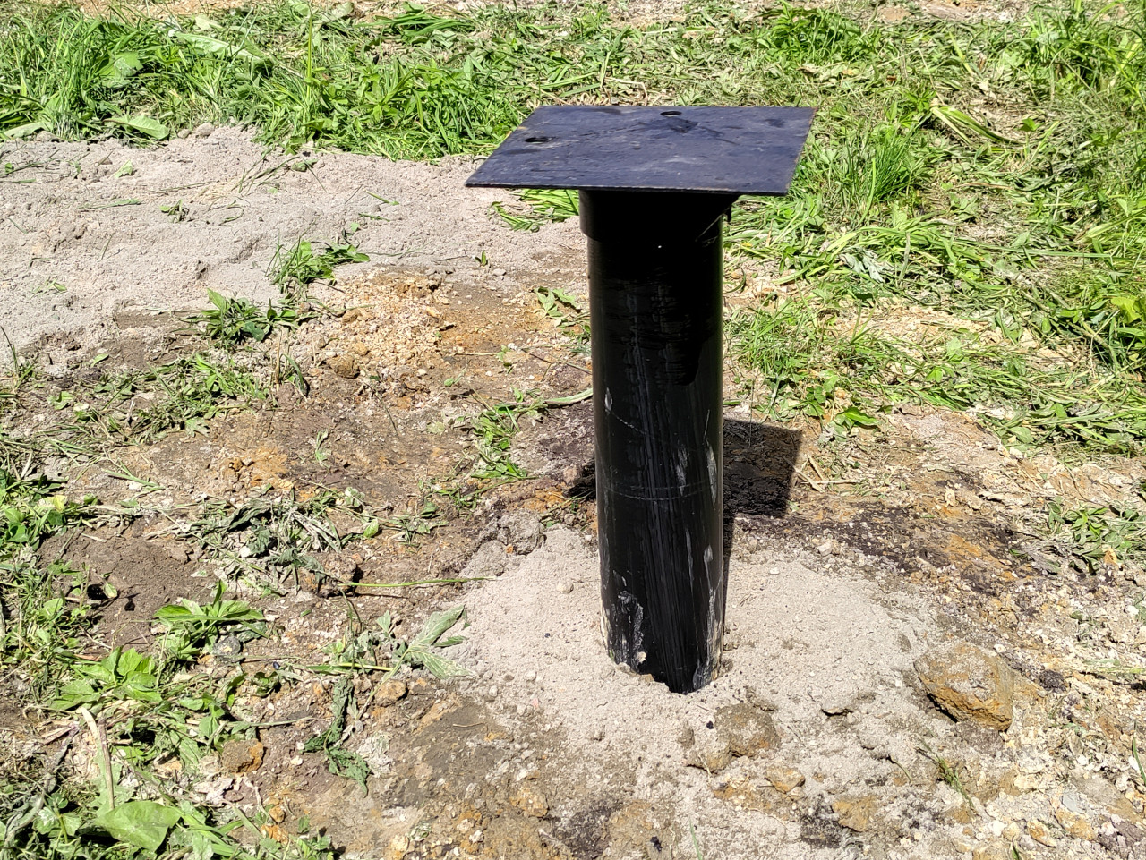 Июнь 2024, крупный план: металлическая свая фундамента под дом выходит из грунта и имеет оголовок с квадратной площадкой и отверстиями под болты/саморезы. На поверхности видны следы монтажа, грязь и потёртости, вокруг основания заметны подсыпка, комки земли и мелкий камень. На заднем плане разровненная почва и зелёные растения, глубина резкости мала. Фото уместно для инструкций по монтажу свайно-винтового фундамента, материалов о креплении обвязочного бруса/металлопрофиля и строительных чек-листов.