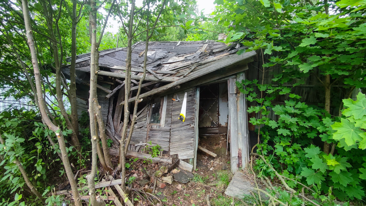 заброшенный дом деревянная постройка ветхое здание руины разрушение запустение сельская местность архитектура деревянный дом старая постройка заброшенное здание ветхость разрушенная крыша деформация обвал доски входной проём пристройка хозяйственное строение мусор древесные обломки ручной инструмент пила секатор заросли кусты деревья зелёные насаждения лесополоса заброшенная территория износ материалов фактура документальная съёмкаПохожие фотографии
