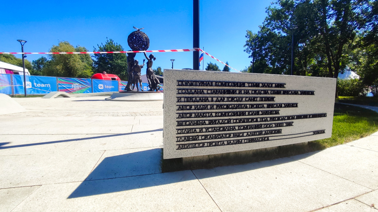 Скульптура «Семья — залог мира» и гранитный камень с ограждением на площадке Парка 300-летия Санкт-Петербурга