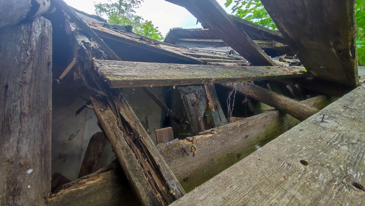 заброшенный дом деревянная постройка ветхое здание руины разрушение запустение сельская местность аварийное строение крыша обрушение завалы стропила балки обрешётка доски гвозди трещины гниение износ ветхость строительные конструкции кровельный материал разрывы в крыше мох древесная фактура техобследование технический осмотр демонтаж ремонт реконструкция природное зарастание зелёная листваПохожие фотографии