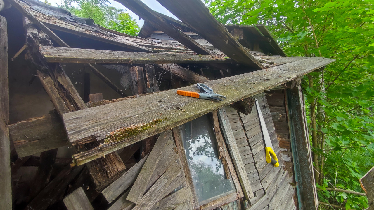 заброшенный дом деревянная постройка ветхое здание руины разрушение запустение сельская местность заброшенное строение деревянный дом аварийное здание перекошенная стена обрушенная кровля балки перекрытия доски оконный проём окно с отражением деревянная обшивка завал строительный мусор гниль износ мох ручная пила секатор садовый инструмент ремонт реконструкция техобследование строительный контроль безопасность заросли деревья заброшенная усадьба разрушенный фасадПохожие фотографии