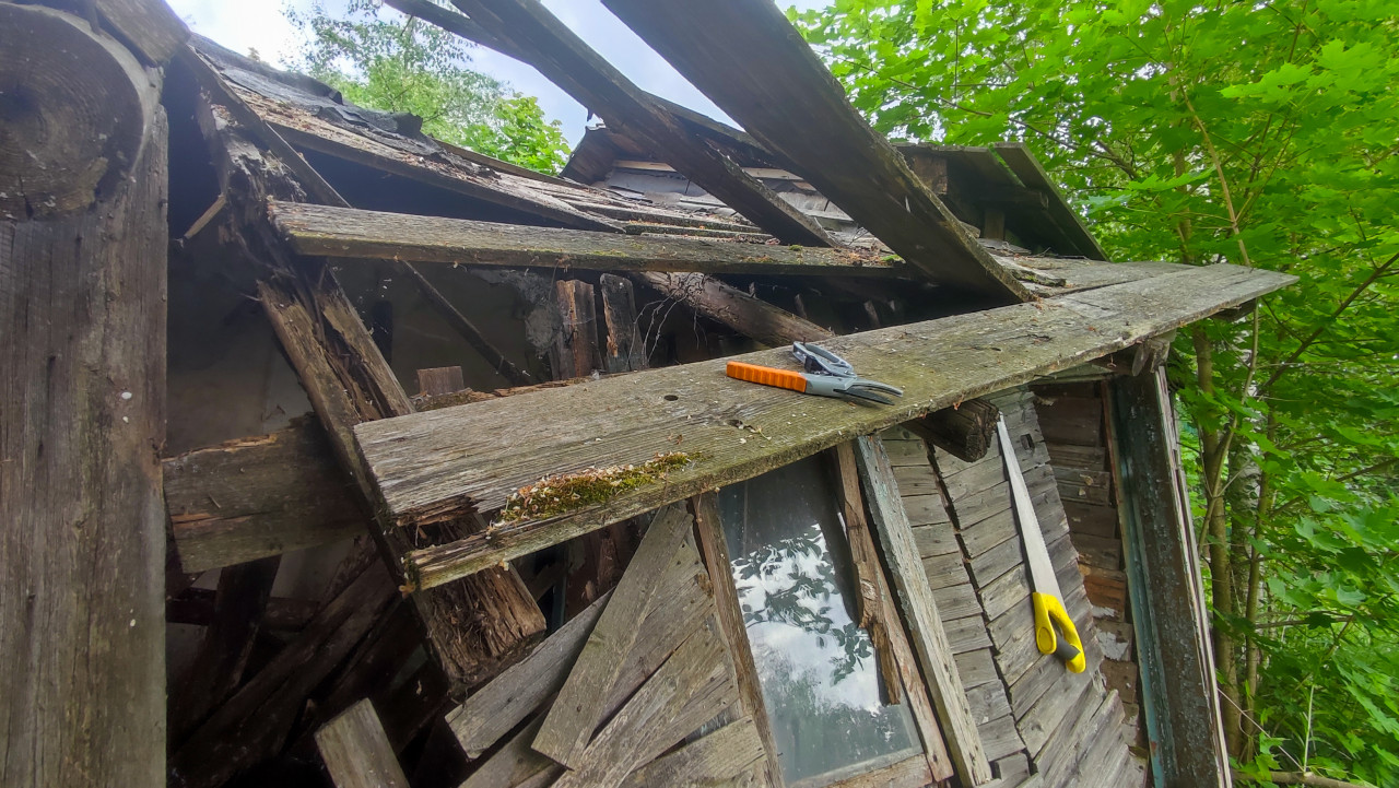 заброшенный дом деревянная постройка ветхое здание руины разрушение запустение сельская местность разрушенная постройка деревянные конструкции обрушение крыша стропильная система балки доски торчащие гвозди окно обломки обшивки ветхость старое дерево гниение мох текстура древесины строительный мусор завал секатор ручная пила ремонт демонтаж реставрация обследование здания безопасность работ заросли лес заброшенный участокПохожие фотографии