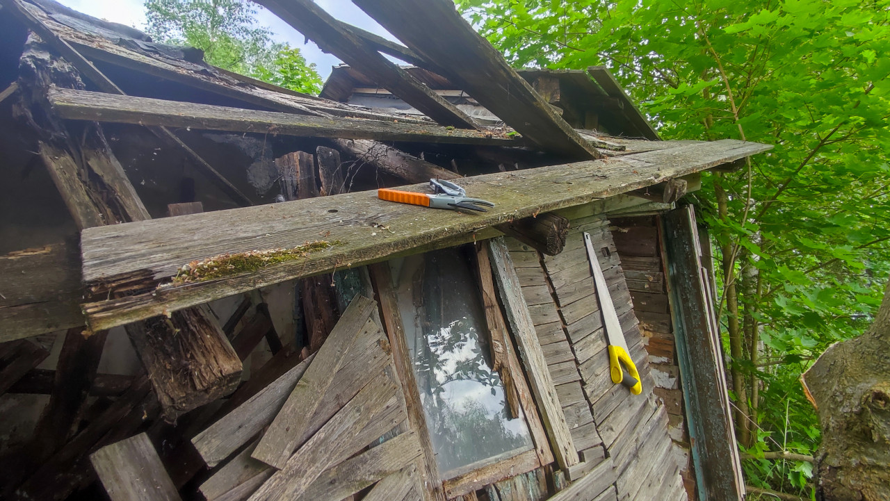 заброшенный дом деревянная постройка ветхое здание руины разрушение запустение сельская местность заброшенный деревянный дом аварийный объект обрушенная крыша стропила балки доски деформация стен оконный проём отражение деревьев секатор ручная пила инструменты строительный мусор завал досок гниение древесины мох трещины заброшенная территория заросли ствол дерева камень техосмотр обследование ремонт демонтаж реконструкция безопасностьПохожие фотографии