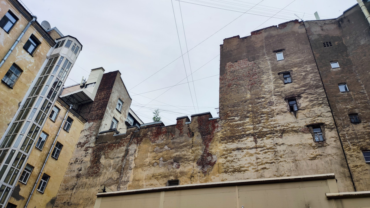 город санкт петербург архитектура жилой дом фасад окна двор улица городская среда историческая застройка старый дом внутренняя застройка двор колодец стены штукатурка облупившаяся краска кирпичная кладка фактура водостоки ремонт износ реставрация капитальный ремонт стеклянная шахта лифта внешний лифт провода воздушные линии небо графика линий городской пейзаж историческая среда Санкт Петербург дворовые коммуникацииПохожие фотографии
