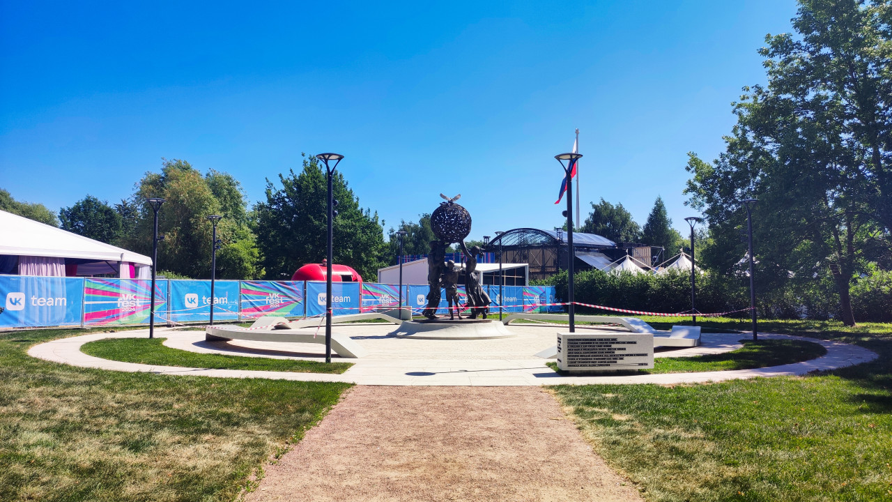 Скульптурная композиция «Семья — залог мира» в Парке 300-летия Санкт-Петербурга на фоне ограждений и сцены