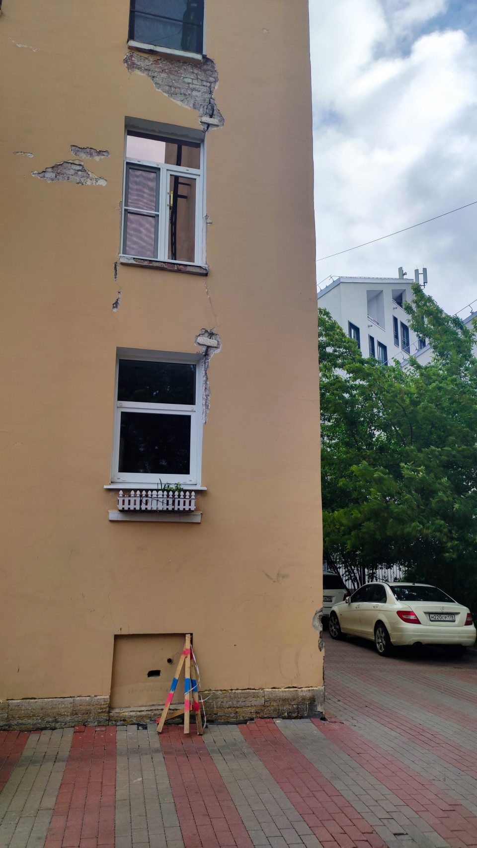 город санкт петербург архитектура жилой дом фасад окна двор улица городская среда историческая застройка торцевая стена штукатурка отслоение штукатурки облупившаяся краска трещины повреждения фасада оголенный кирпич кирпичная кладка подоконник ремонт фасада обследование здания капитальный ремонт аварийное состояние дефекты строительная экспертиза стремянка тротуарная плитка припаркованный автомобиль деревья пасмурное небо городская инфраструктура ЖКХ обслуживание домаПохожие фотографии