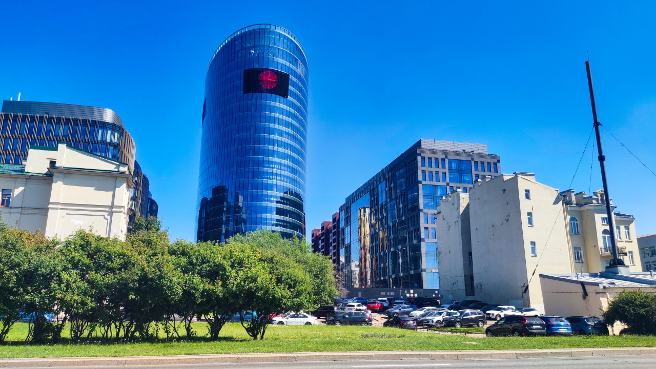 Июнь 2024, городской квартал: в центре кадра высокая офисная башня с округлым фасадом из синего стекла, отражающего небо; на верхней части установлен крупный медиаэкран с красным круговым изображением. Рядом расположены современные здания со стеклянными витражами и несколько старых оштукатуренных домов, контрастирующих по стилю и состоянию фасадов. На переднем плане зелёная полоса с кустами и газоном, у домов припаркованы автомобили, вдоль дороги тянется бордюр. Фото подойдёт для тем про современную архитектуру, бизнес-недвижимость и развитие городских районов.