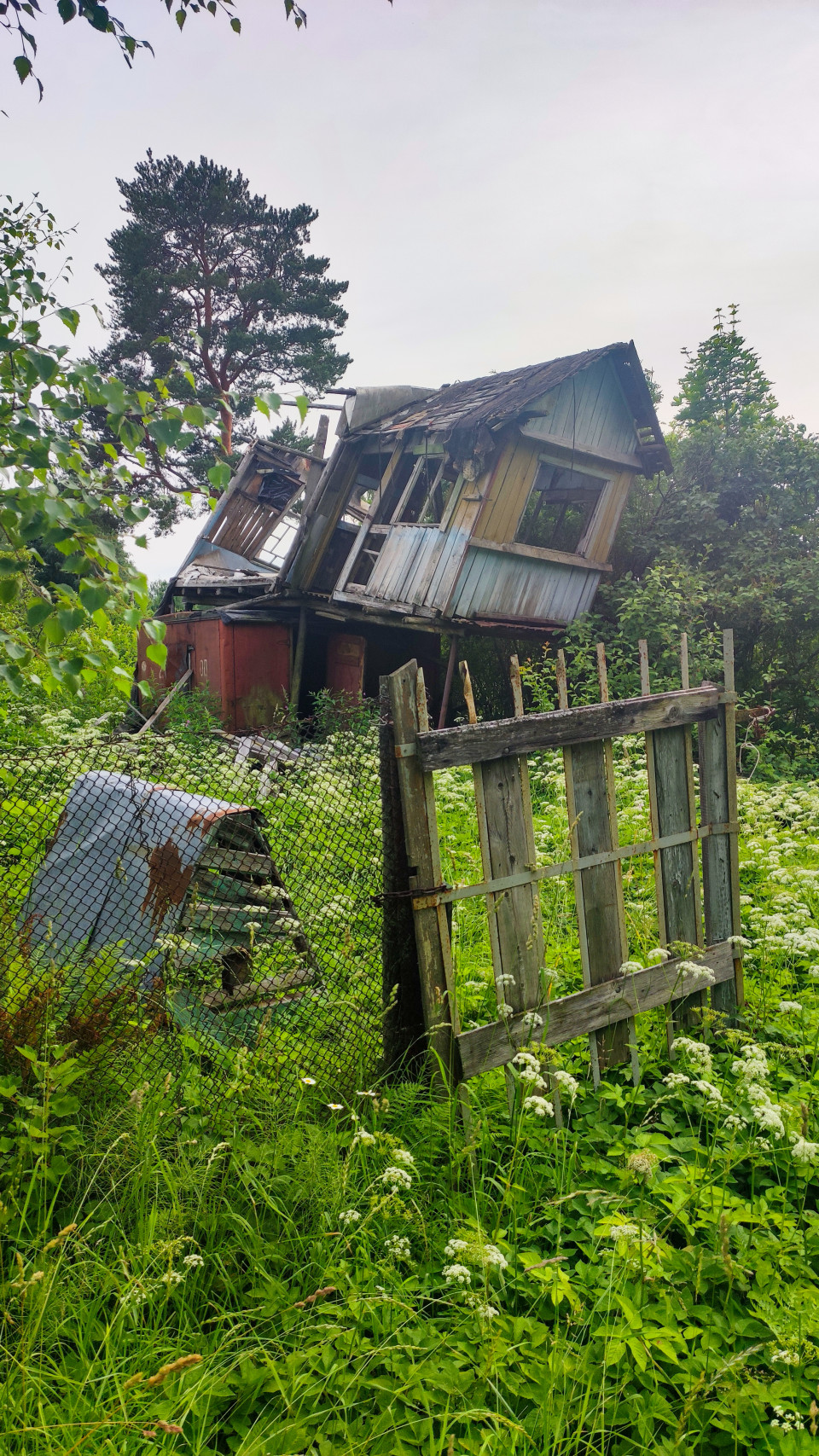 заброшенный дом деревянная постройка ветхое здание руины разрушение запустение сельская местность ветхий дом аварийное состояние перекос разрушенная крыша пустые окна дача заброшенная дача заросли кустарник высокая трава белые зонтичные цветы старый забор сетка рабица листы металла строительный мусор заброшенная недвижимость безопасность риск обрушения урбан исследования сельский пейзаж лето дерево зеленьПохожие фотографии