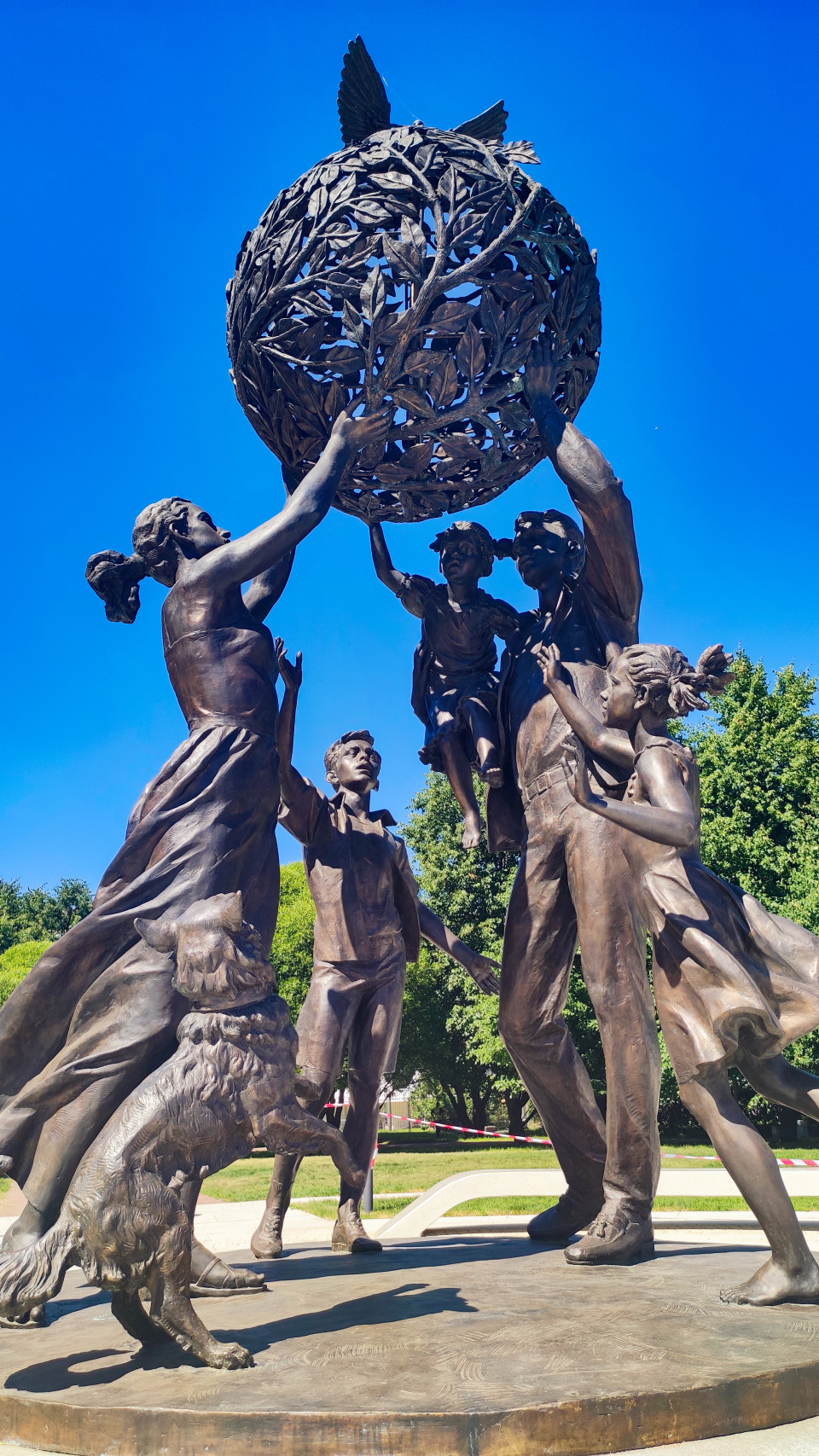 Ракурс снизу на «Семья — залог мира»: фигуры семьи и собака поднимают земной шар с голубями