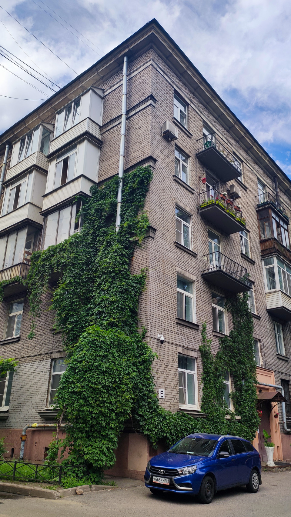 город санкт петербург архитектура жилой дом фасад окна двор улица городская среда историческая застройка Санкт Петербург кирпичный фасад пятиэтажка городская архитектура балконы карниз кровля провода воздушные линии коммуникации плющ плющ обыкновенный вьющиеся растения вертикальное озеленение зелёный фасад листья водосточная труба кондиционер тротуар парковка автомобиль облака пасмурно июнь 2024Похожие фотографии