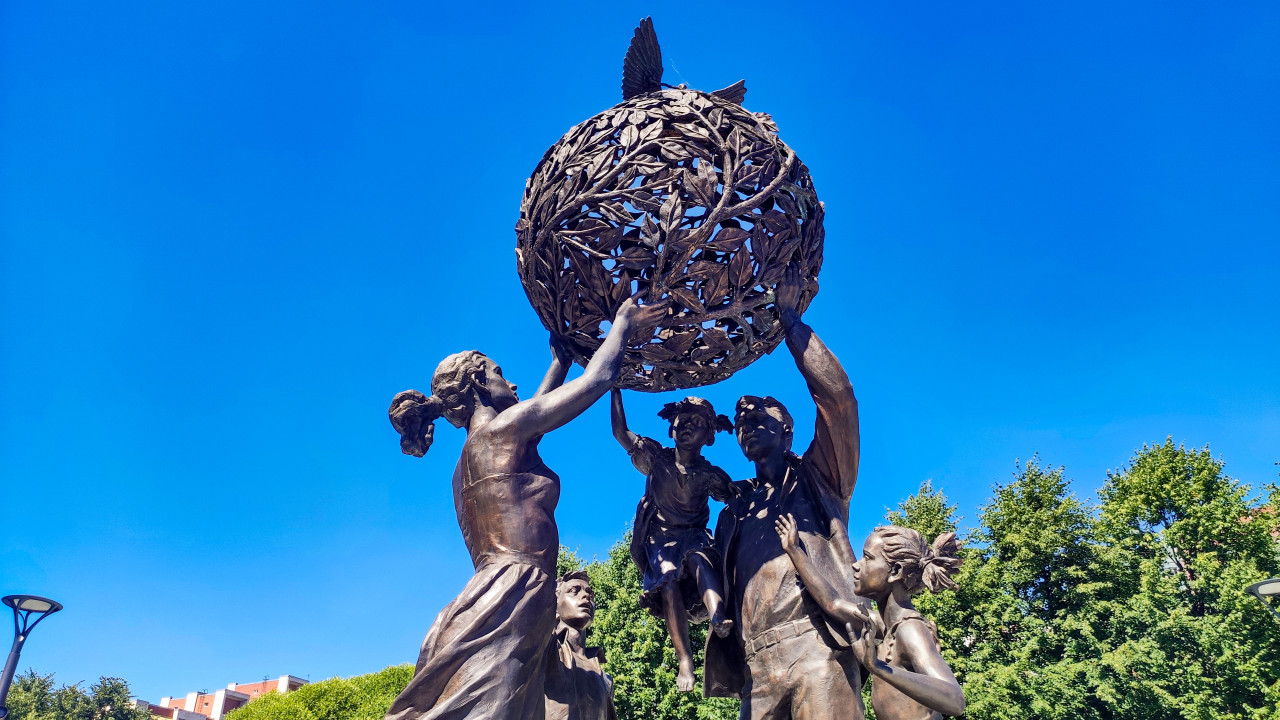 Бронзовые фигуры семьи поднимают земной шар из ветвей в композиции «Семья — залог мира»