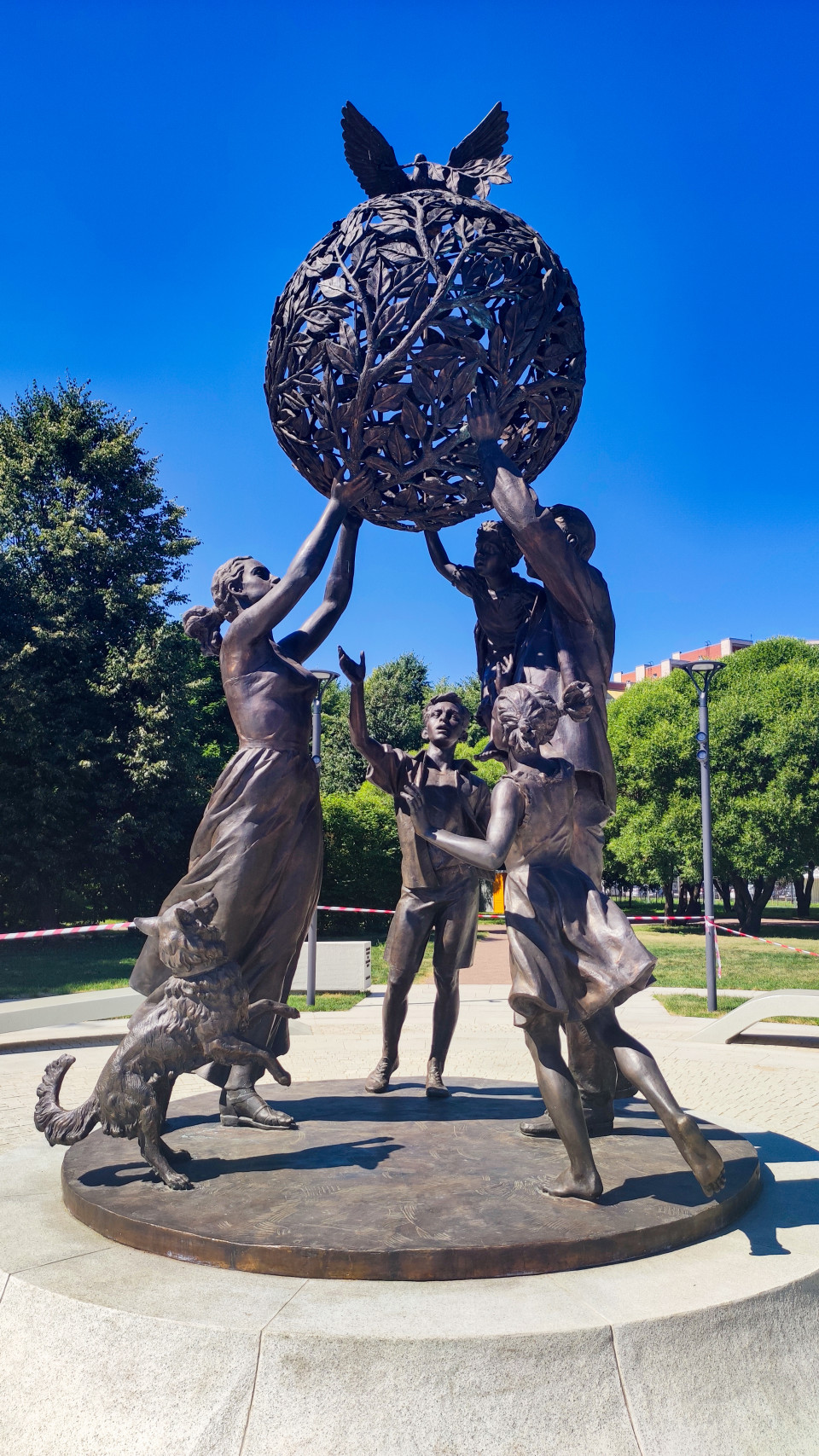 Июнь 2024, Санкт-Петербург, Парк 300-летия: в кадре бронзовая скульптурная композиция «Семья — залог мира», где мама, папа, трое детей и собака поддерживают стилизованный земной шар, сплетённый из ветвей и окружённый голубями как символами мира. Монумент создан по эскизу художницы Юлии Заренковой; автор идеи и меценат, подаривший скульптуру городу, — Вячеслав Заренков. Торжественное открытие состоялось 20 июня 2024 года и было приурочено к Году семьи. Фото подходит для материалов о городской культуре, семейных проектах и общественных пространствах.