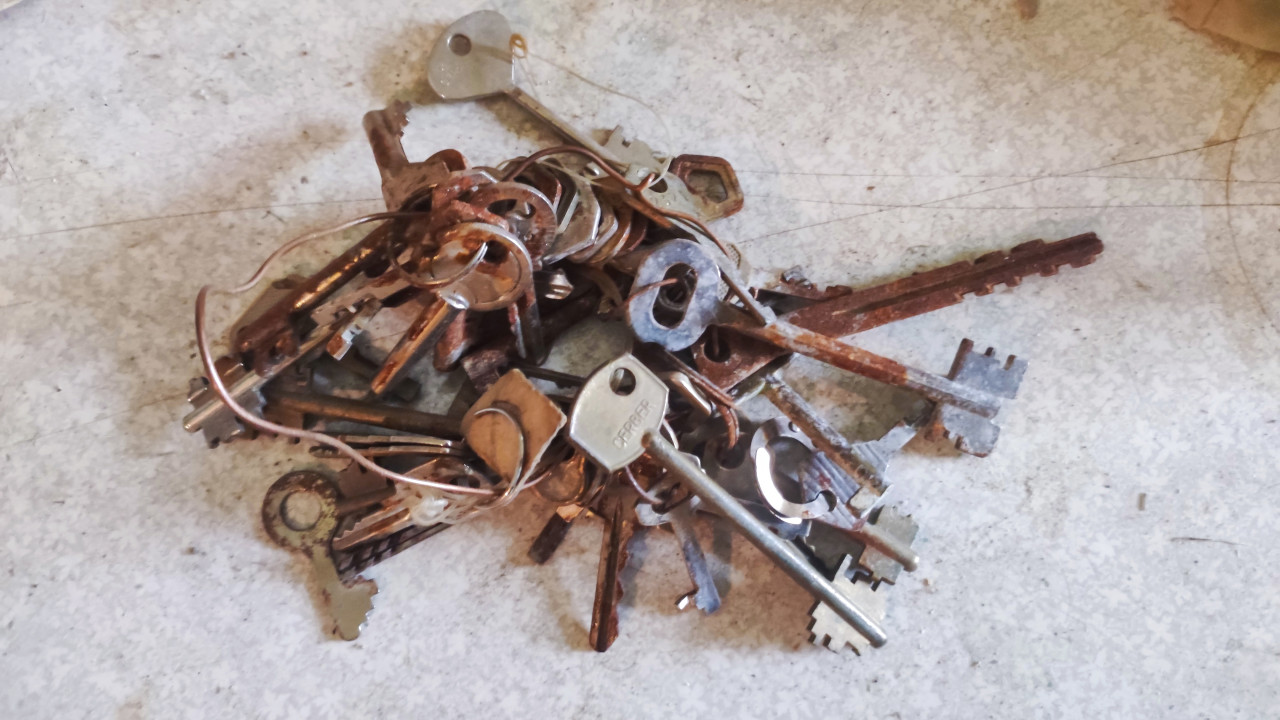 предметы ключи связка ключей металл кольцо для ключей проволока бирка ржавчина коррозия износ пыль длинный ключ бородка ключа замочные ключи металлические пластины проволочная скрутка пластиковая метка пятна пыльный пол текстура старые вещи быт безопасность контроль доступа замочная скважина служебный инвентарь утрата имущества заброшенное помещение хаос урбанистика урбекс документальная фотографияПохожие фотографии
