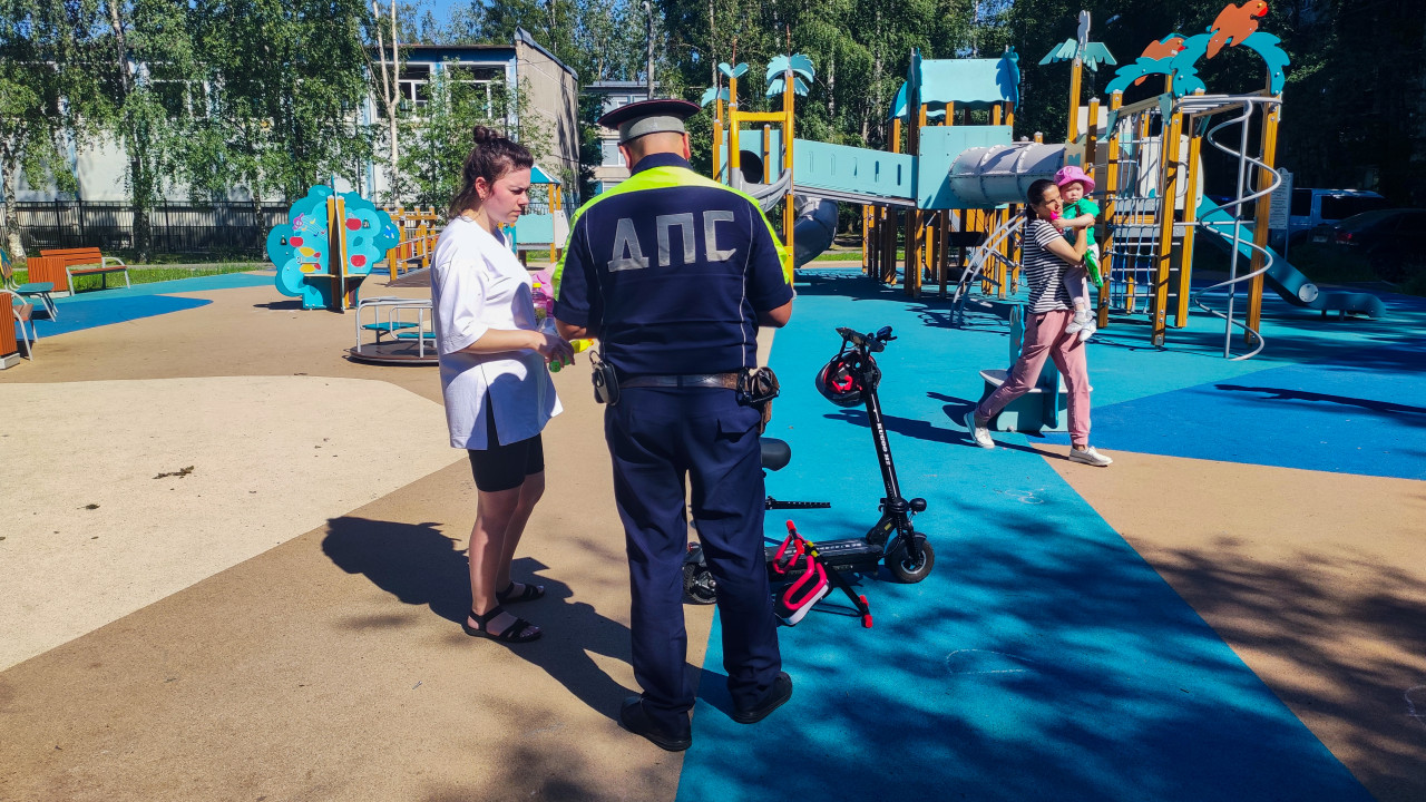 Сотрудник ДПС и женщина стоят на детской площадке возле электросамоката и шлема
