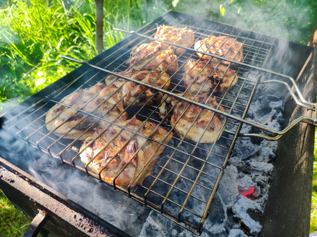 Крупный план мангала: куски курицы зажаты решёткой-гриль и жарятся над слоем серых углей и золы. На мясе видны полосы поджарки и потемнения от огня, по краям поднимается дым, в углях заметен красный тлеющий участок. В кадре читаются металлические прутья решётки и ручки фиксатора, фон зелёный и размытый. Снимок подходит для рецептов и статей о гриле, технологиях жарки на углях, дачном меню, сезонном отдыхе и иллюстраций про уличную кулинарию.