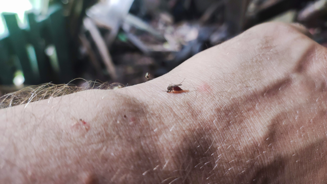 Снимок выполнен крупным планом: на коже руки находится мелкое кровососущее насекомое, рядом заметно красное пятно и небольшая капля крови. Хорошо различима текстура кожи, отдельные волоски и складки в области сустава, что подчёркивает макросъёмку. Задний план размытый, с фрагментами деревянных досок, обломков и мусора, без узнаваемых объектов. Освещение естественное, без постановочного света. Фотография может использоваться в публикациях о сезонной активности насекомых, укусах, средствах защиты и репеллентах, а также в учебных материалах по биологии и энтомологии.
